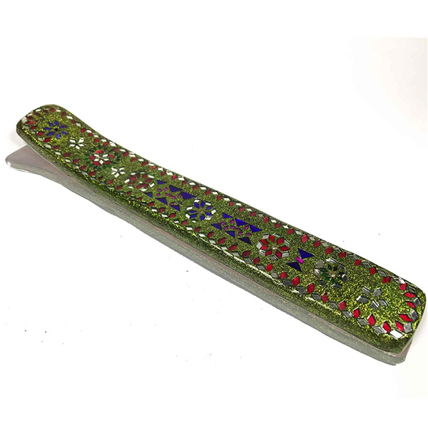 Es un Incensario largo, que puede soportar sticks. Es de madera, y está recubierto por pintura y textura lacada, con cristales de distintos colores. Son de gran variedad cromática, con un toque brillante de purpurina.