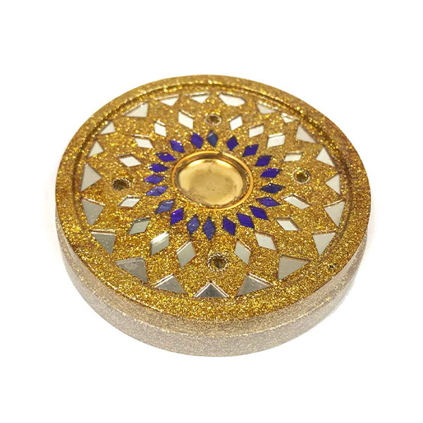 Es un Incensario, que puede soportar sticks y conos. Está recubierto por pintura y textura lacada, con cristales de distintos colores. Son de gran variedad cromática, con un toque brillante de purpurina, y pueden variar de color.