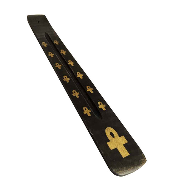 Incensario de madera, con decoraciones en la punta y los laterales. Diseñado para incienso en sticks.