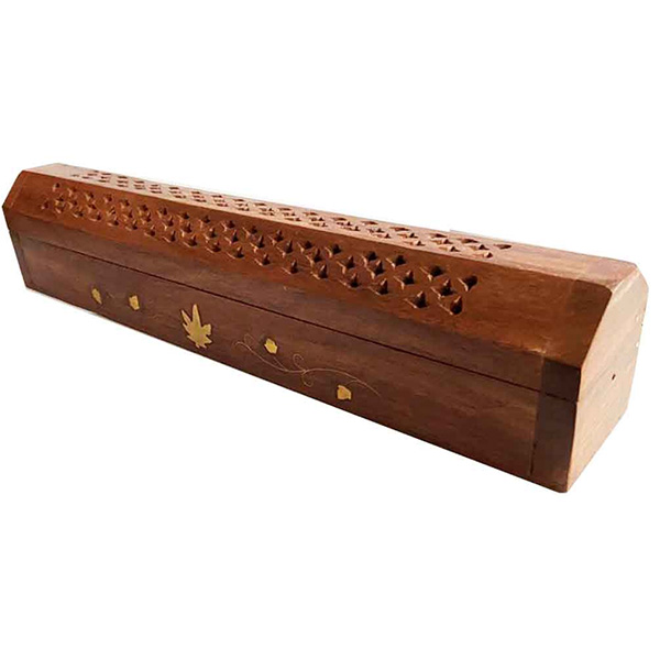 Incensario de madera que es una cajita donde dentro se coloca la varilla de incienso en horizontal, y su humo sale por la celosía grabada a mano, creando un efecto místico. Y tiene una decoración natural por los costados. También soporta incienso en conos. Tiene un compartimento para almacenar las varillas de incienso.