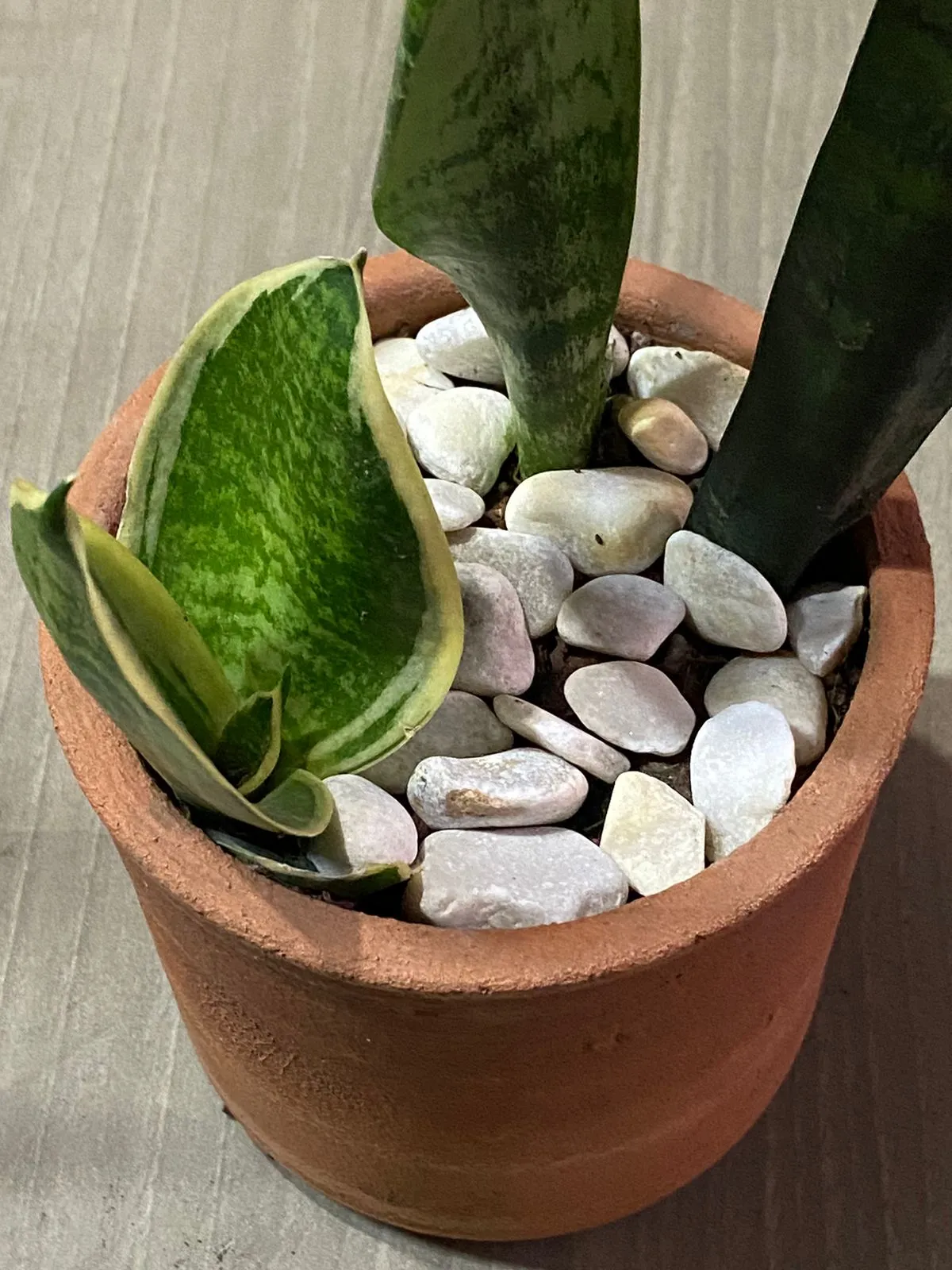 Diseño y Decoración: La Sansevieria mini variegada, con sus hojas de tonos verdes y amarillos, y la Sansevieria clásica, de un verde profundo, crean un contraste vibrante. La maceta de barro cocido aporta un acabado terroso que resalta la belleza natural de las plantas, haciéndolas una obra de arte viva para tu hogar o oficina. 🎨🍃