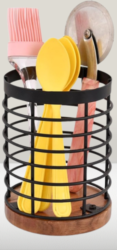 Este soporte para utensilios de encimera está hecho de hierro con base de madera soporte negro para utensilios que combina con todos los estilos de decoración de cocina para añadir un toque de color a tu cocina.