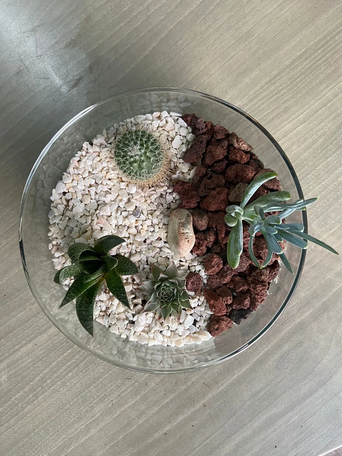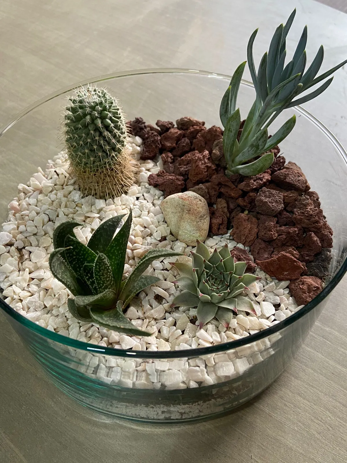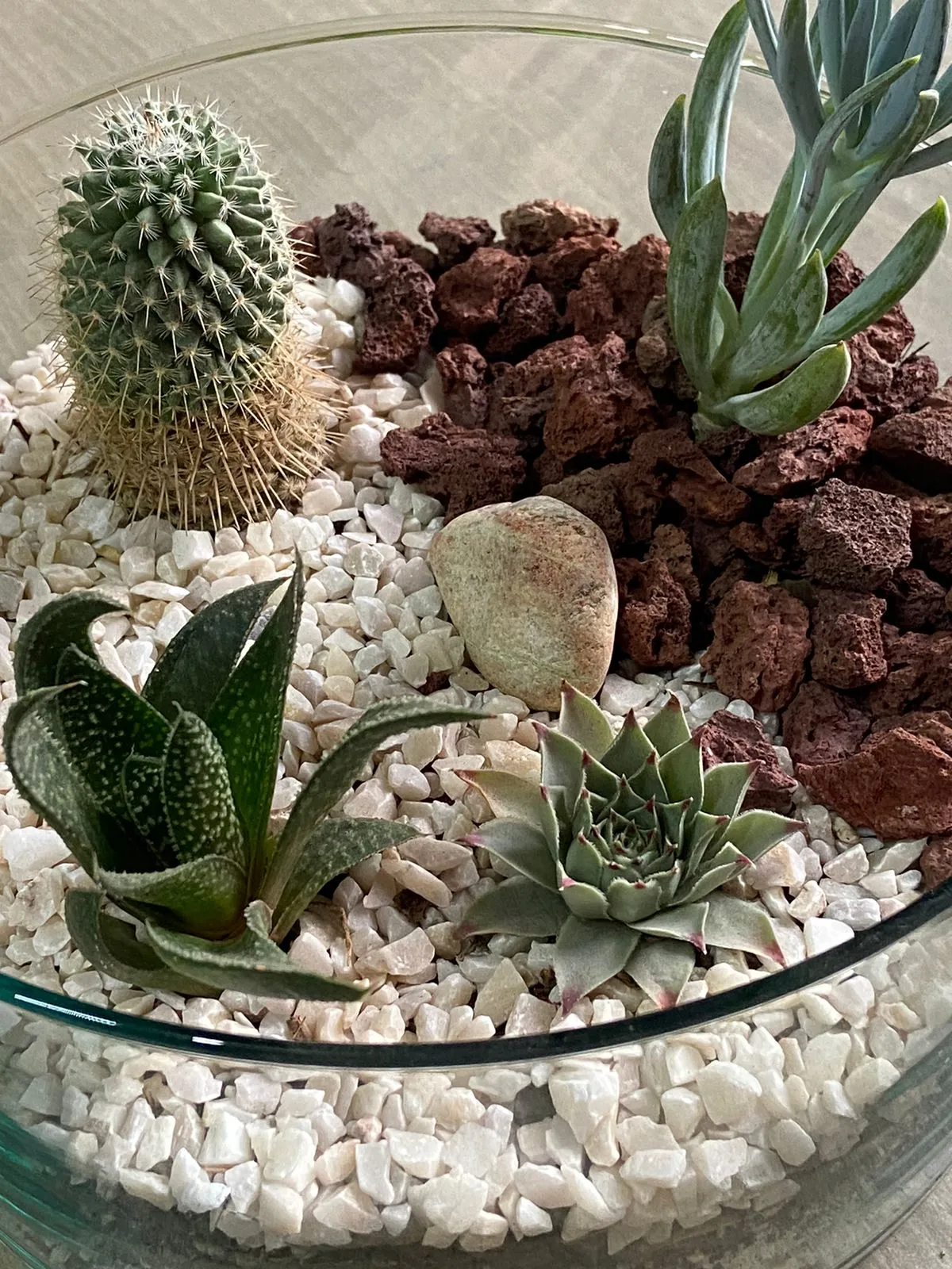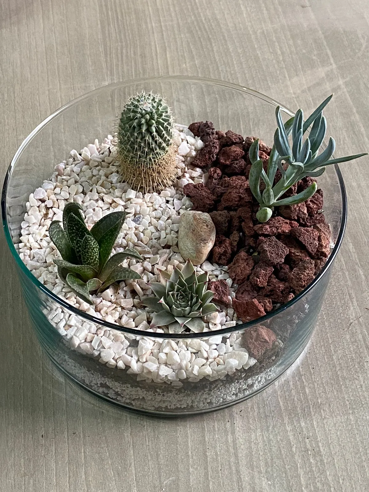 Por Qué Elegir Este Terrario: Es un ecosistema autosuficiente que te trae la serenidad del desierto y el encanto de los jardines rocosos, todo en la comodidad de tu hogar. Una pieza de conversación que requiere mantenimiento mínimo.