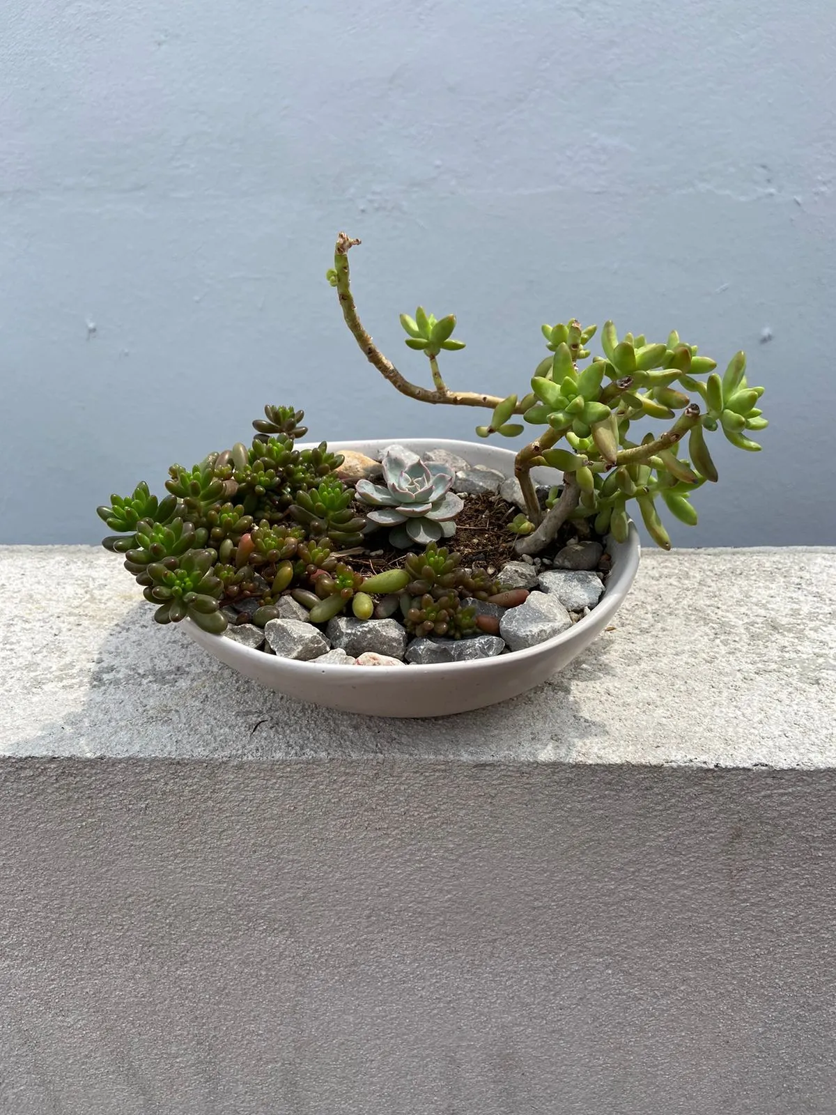 Tazón de cerámica color beige, contiene 3 tipos distintos de suculenta.