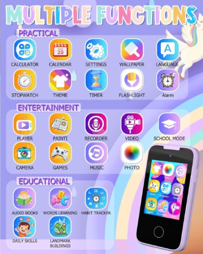 【Teléfono inteligente para niños todo en uno】: con 23 funciones de entretenimiento educativas y prácticas que incluyen juegos dibujo música tomar fotos tarjetas de cartas seguimiento de hábitos audiolibros calendarios etc. este teléfono celular inteligente satisface todas las necesidades de los niños. El modo escolar permite a los padres controlar el tiempo de juego. Los niños pueden personalizar el teléfono a partir de 31 fondos de pantalla y 11 temas.