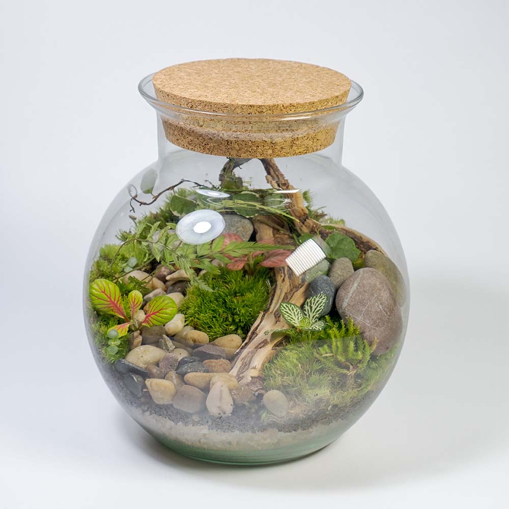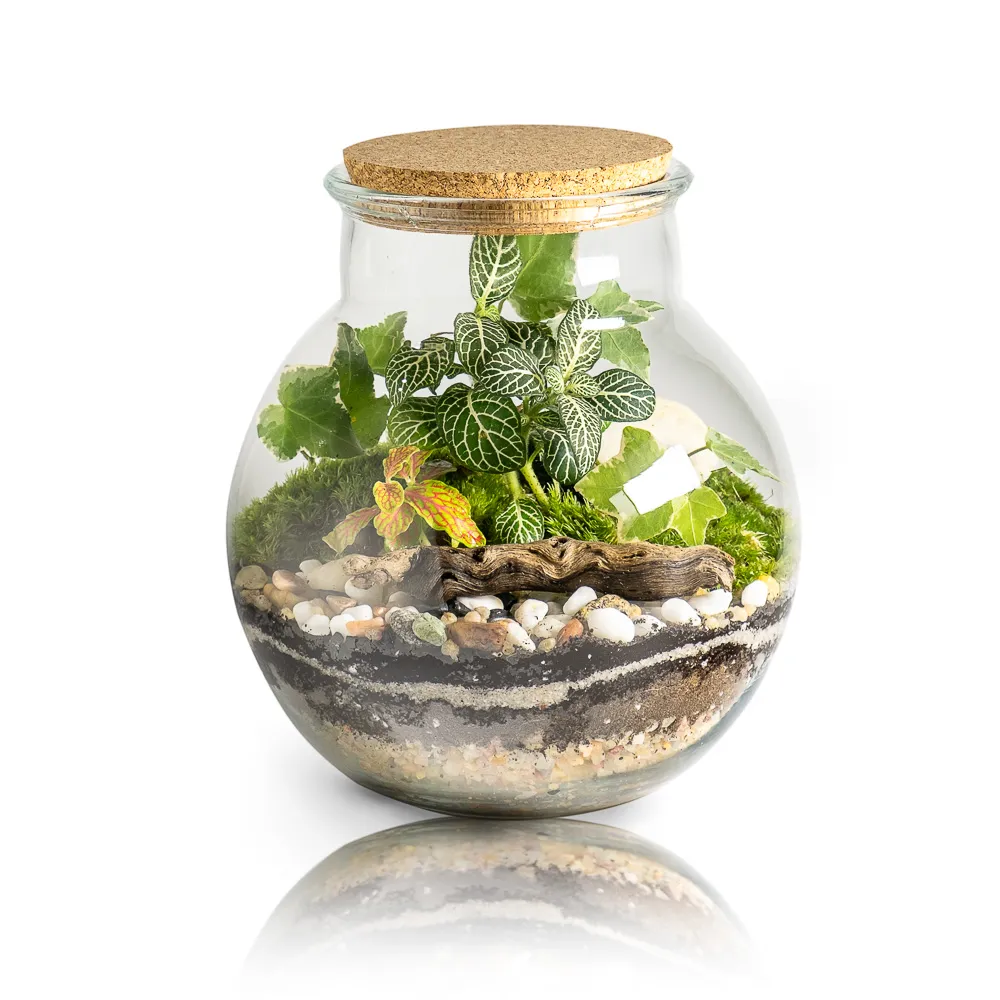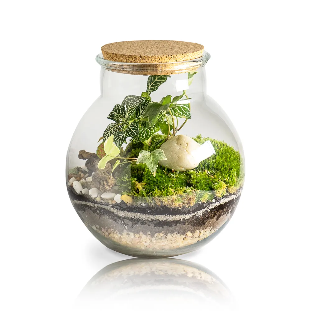 El Terrario eterno Cioyo es un pequeño ecosistema creado a partir de una selección de plantas naturales dentro de un recipiente de cristal con forma de bola con cuello y tapa de corcho natural. Este mini paisaje está formado por Fittonias de dos variedades, Ficus Pumila, musgo de bola, Rocas y grava decorativa.