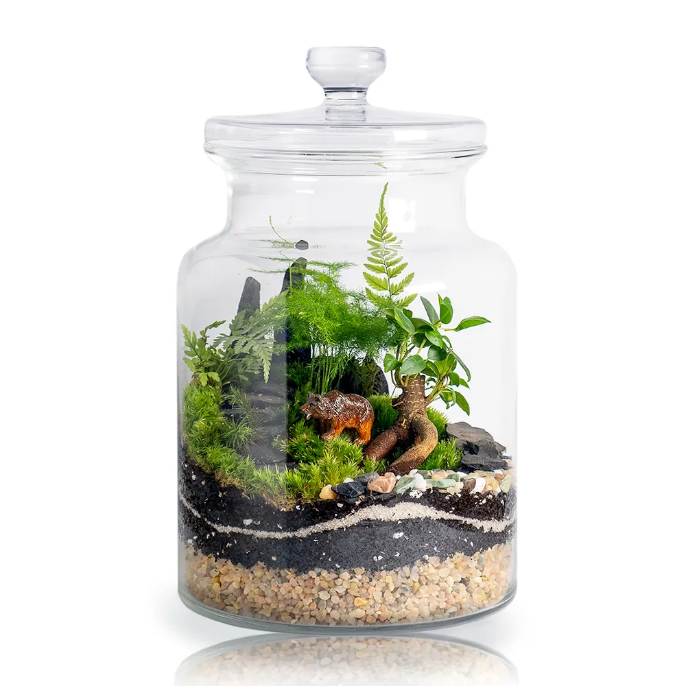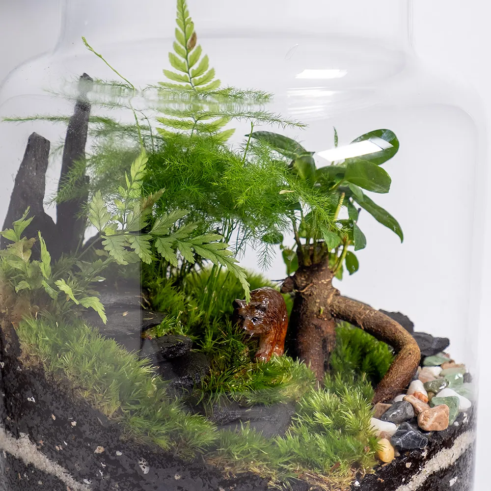 El Jardín Eterno Guanga es un pequeño ecosistema creado a partir de una selección de plantas naturales dentro de un terrario con tapa de cristal. Este mini paisaje está formado por un Ficus Ginseng P, Asparagus plumosus, helecho athyrium, musgo de bosque, gravilla y rocas decorativas.