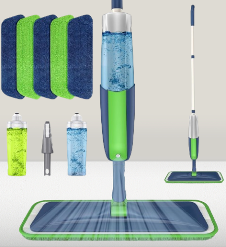 Paquete de 2 botellas recargables de 410 ml: el trapeador en aerosol Mexerris viene con 2 botellas de agua recargables antifugas no tiene el problema de fugas después de su uso. Debido a que puede obtener 2 tanques de agua de reemplazo puede agregar su limpiador funcional diferente o agua en una botella para todo tipo de pisos en su baño sala de estar cocina como madera dura madera laminada baldosas de cerámica y vinilo. Y no tiene que preocuparse por desperdiciar nada de la solución. NO agregue ácido fuerte ni agua hirviendo a la botella.Cinco almohadillas de repuesto para trapeador: las almohadillas de microfibra recogen todo del piso (agarran la suciedad el polvo el pelo de las mascotas las migas y la humedad) y dejan las cosas con un aspecto muy agradable. Muy fácil de usar un buen trapeador. El trapeador en aerosol puede derramarse rápidamente en el piso o en cualquier lugar de su casa donde lo necesite. Las 5 almohadillas para trapeador se pueden lavar a máquina cuando haya terminado el trabajo de limpieza no es necesario tirarlas. Puedes tirarlos a la lavadora y luego tendrás otro listo para la próxima vez.Rascador adicional con peine y diseño para colgar: el trapeador plano de microfibra en aerosol que viene con el raspador multifunción puede presionar agua sobre las almohadillas del trapeador en aerosol eliminar la suciedad y las manchas en el piso/baldosas. La fregadora tiene 4 lados diferentes una parte de goma en el medio una parte plana y pequeños dientes en el costado para diferentes tareas de limpieza. El trapeador para pisos tiene un mango acolchado para que puedas colocarlo en la pared. No ocupa espacio