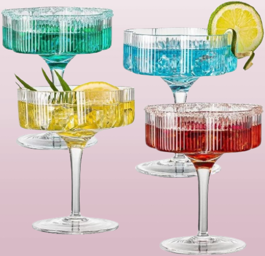 Paquete completo: no hay mejor manera de disfrutar de un vaso de margarita que compartirlo con tu familia y amigos. Nuestros vasos de margarita vienen en un juego de 4 que es perfecto para una pequeña cena con tus seres queridos. Cada vaso tiene una altura de 5.5 pulgadas un diámetro de 4 pulgadas y una capacidad de 8 onzas. Ya sea que prefieras beber o simplemente disfrutar de la vista de jugos frescos exprimidos o champanes flotando en el vaso el juego de vasos Coupe Goblet seguramente impresionará.